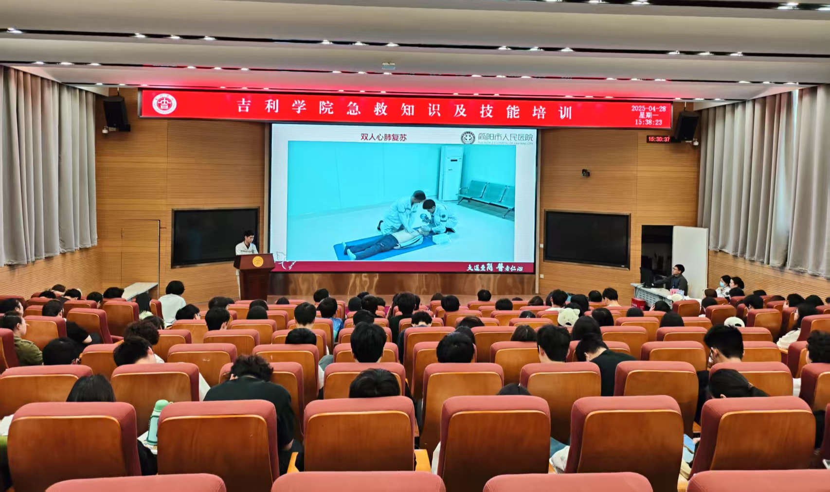 为深入贯彻“人道、博爱、奉献”的红十字精神,落实校园安全教育要求,2025年4月28日,吉利学院后勤处联合简阳市人民医院开展春季学期急救知识培训,全校百余名师生参与。培训通过理论与实操结合,重点普及心肺复苏(CPR)、海姆立克急救法及AED(自动体外除颤仪)操作技能,进一步筑牢校园安全防线。